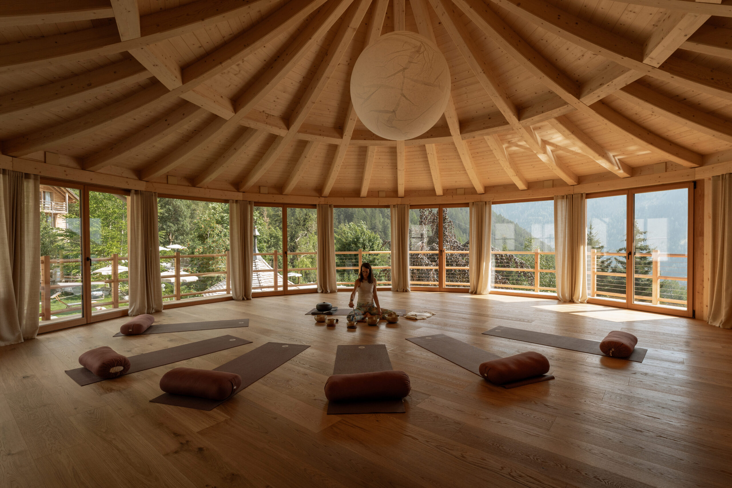 Das Retreat findet im Naturhotel Lüsnerhof in Südtirol statt. Das familiengeführte Hotel verbindet alpine Architektur mit natürlichen Materialien, viel Holz und großzügigen Fensterfronten. Für unsere Praxis haben wir den hellen Panoramasaal mit Blick auf Wiesen, Wälder und Berge. Hier vereinen sich Bewegung, Stille und Natur für innere Ruhe und Klarheit.